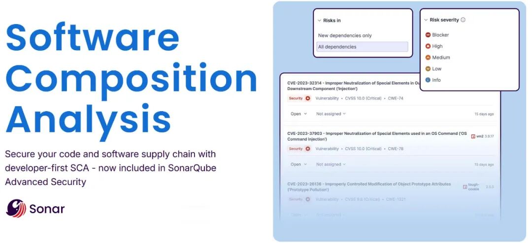 软件组合分析 (SCA) 结果。作为企业版及更高版本的 SonarQube 高级安全许可证的一部分提供