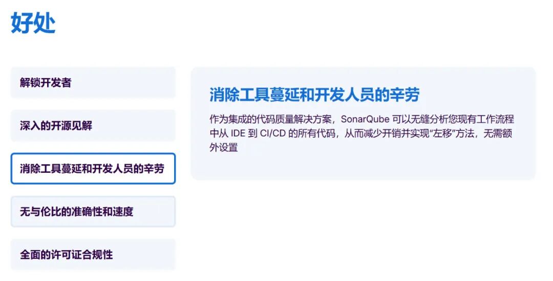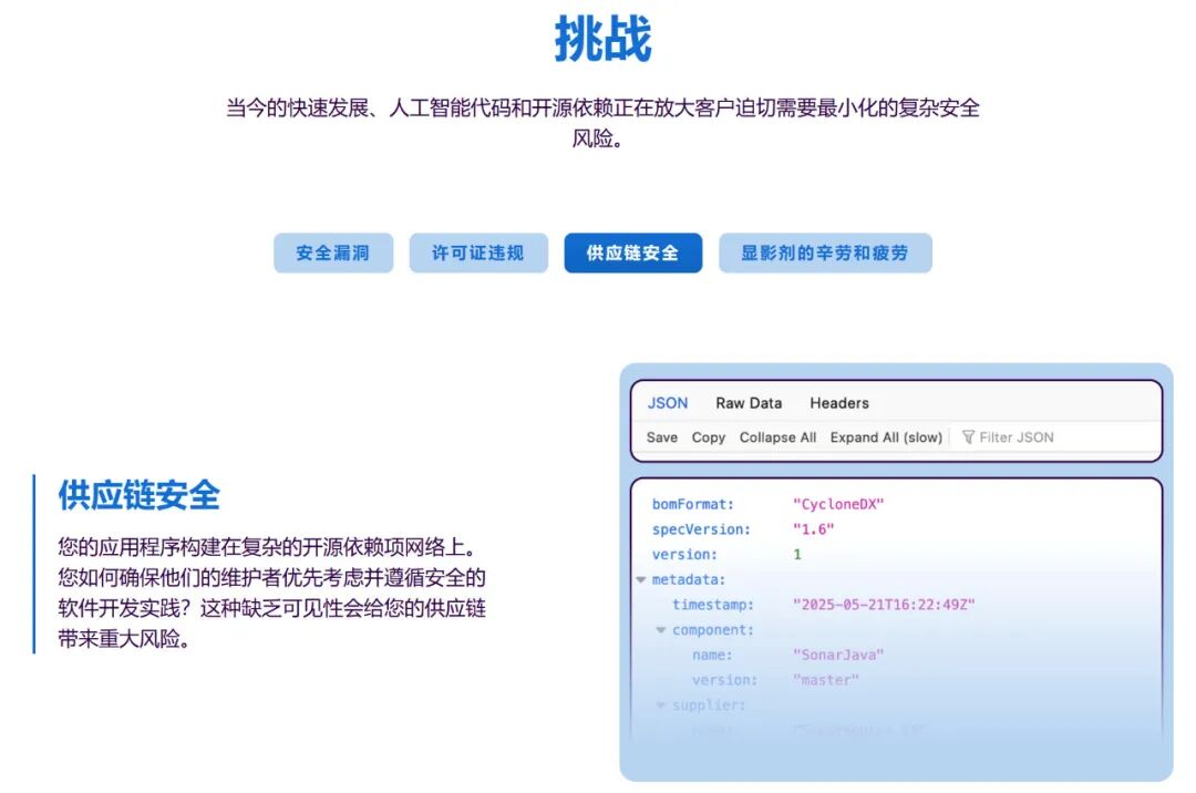 增强了拉取请求和整体代码中每个依赖项版本的安全性和许可风险的可见性。 可配置的质量门可以包括依赖项风险评分,防止具有高风险依赖项的代码进入生产环境。 可配置公司的许可证合规性策略允许组织在 SonarQube 中定义和实施自定义许可证合规性策略。 项目概览屏幕现在显示依赖项风险计数,使开发人员能够立即了解其项目依赖项的运行状况。 发现和分析跨多个应用程序和产品组合的依赖风险。 增强了 SCA 结果和软件物料清单 (SBOM) 的 API 访问,以便与其他工具和自定义报告无缝集成。 SCA 的语言覆盖范围广泛且不断增长,从 Java、C#、Python、JavaScript、TypeScript、Go、Rust 和 Ruby 开始, 确保开发人员可以快速分析第三方依赖项中的漏洞和许可问题。